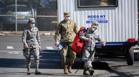 Los aviadores de la Fuerza Aérea de EE. UU. Ayudan a construir una morgue improvisada en la ciudad de Nueva York. Foto: Getty Images.